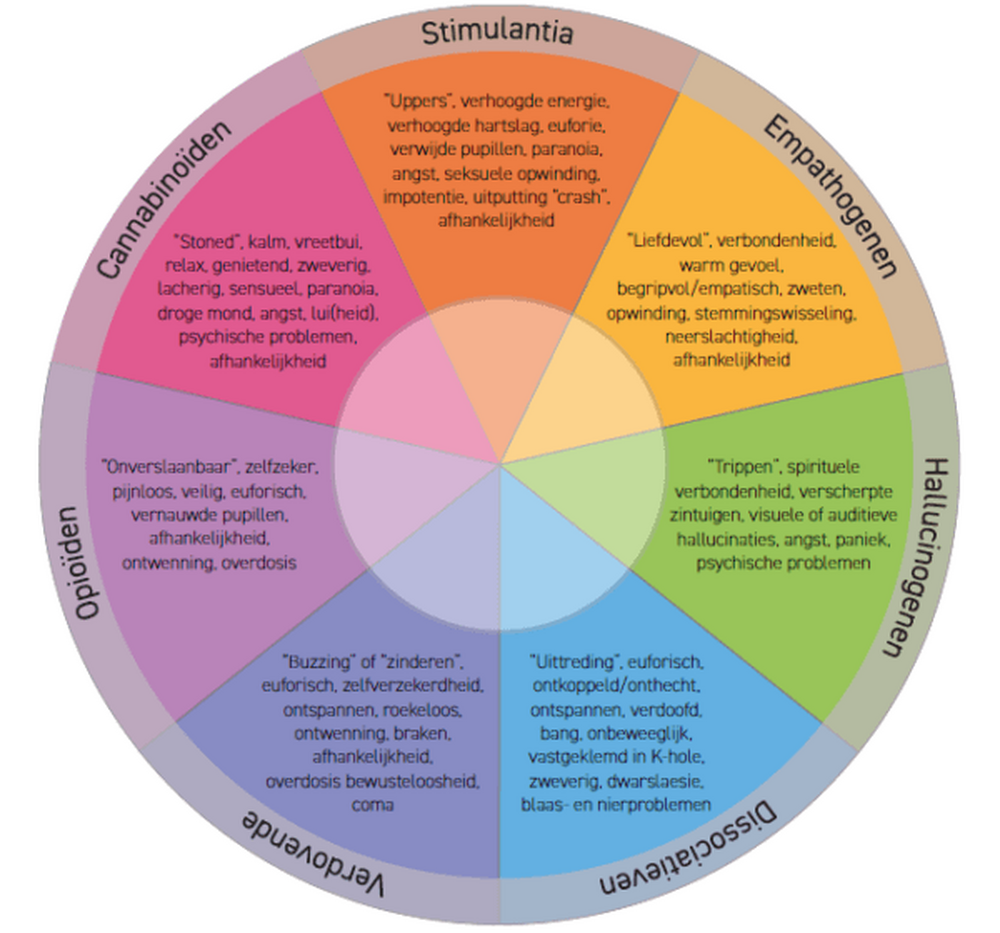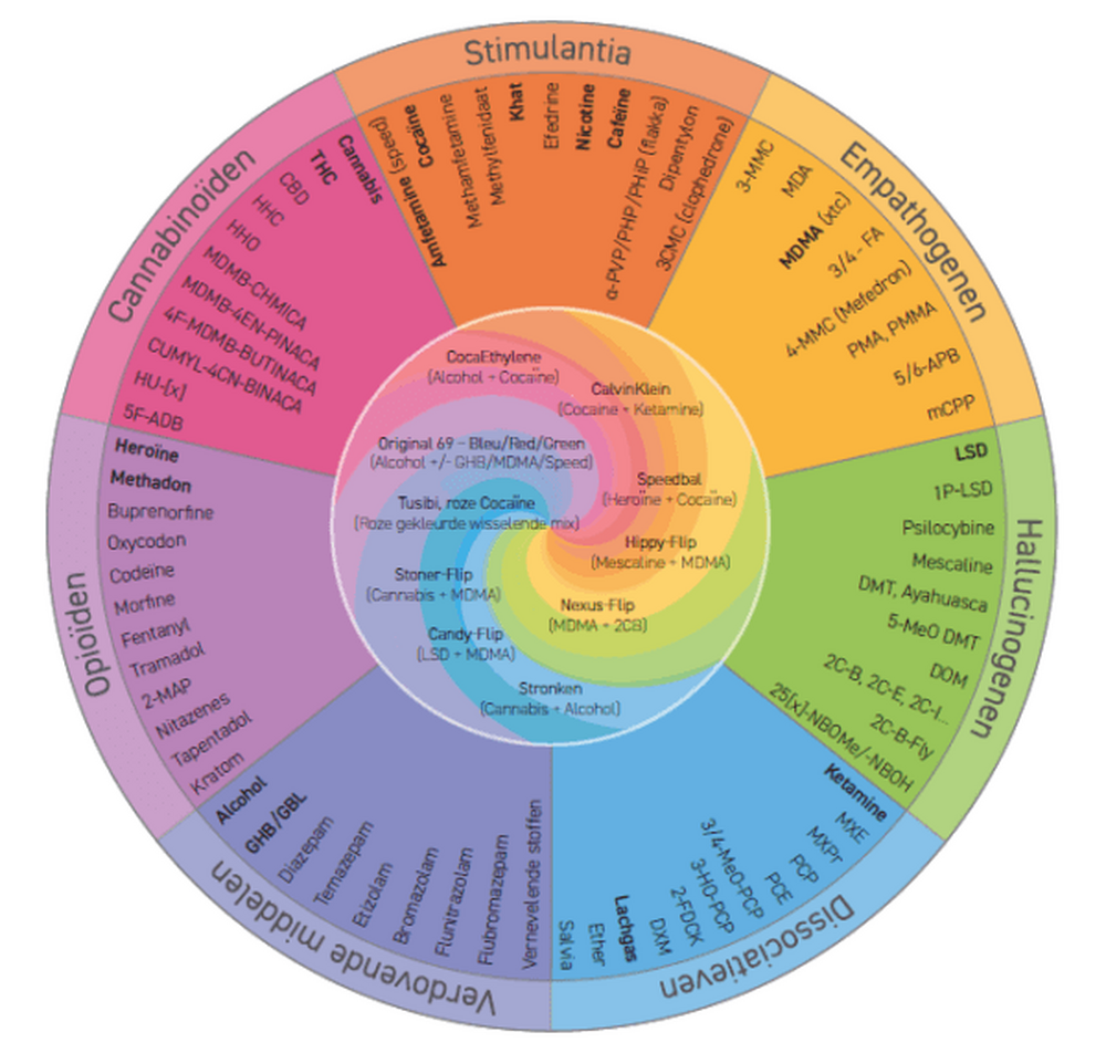 De NK Academie introduceert met trots de vernieuwde versie van het drugswiel. Dit model, gebaseerd op zeven classificaties (stimulantia, empathogenen, hallucinogenen, dissociatieven, verdovende middelen, opioïden en cannabinoïden), biedt een heldere en uitgebreide indeling van middelengebruik.